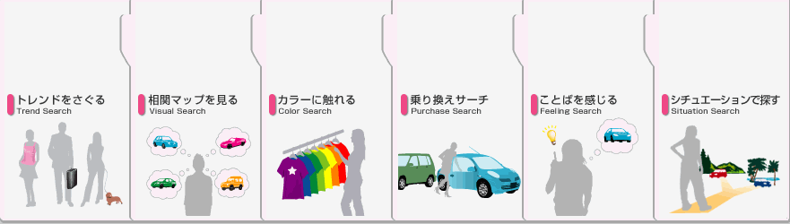 メニューはこれ。 『トレンドをさぐる』 では、他の物と合わせて検索できるのがおもしろい。 例えば、ヴィトンが好きな人は、BMWが好きだろう!という感じ。 『乗り換えサーチ』では、今乗っている車を考慮して、オススメをひっぱりだしてくれる。 日本らしいなぁ、と思ったのが『ことばを感じる』というメニュー。 その名の通り、言葉からイメージで車を検索できます。 Laboo!